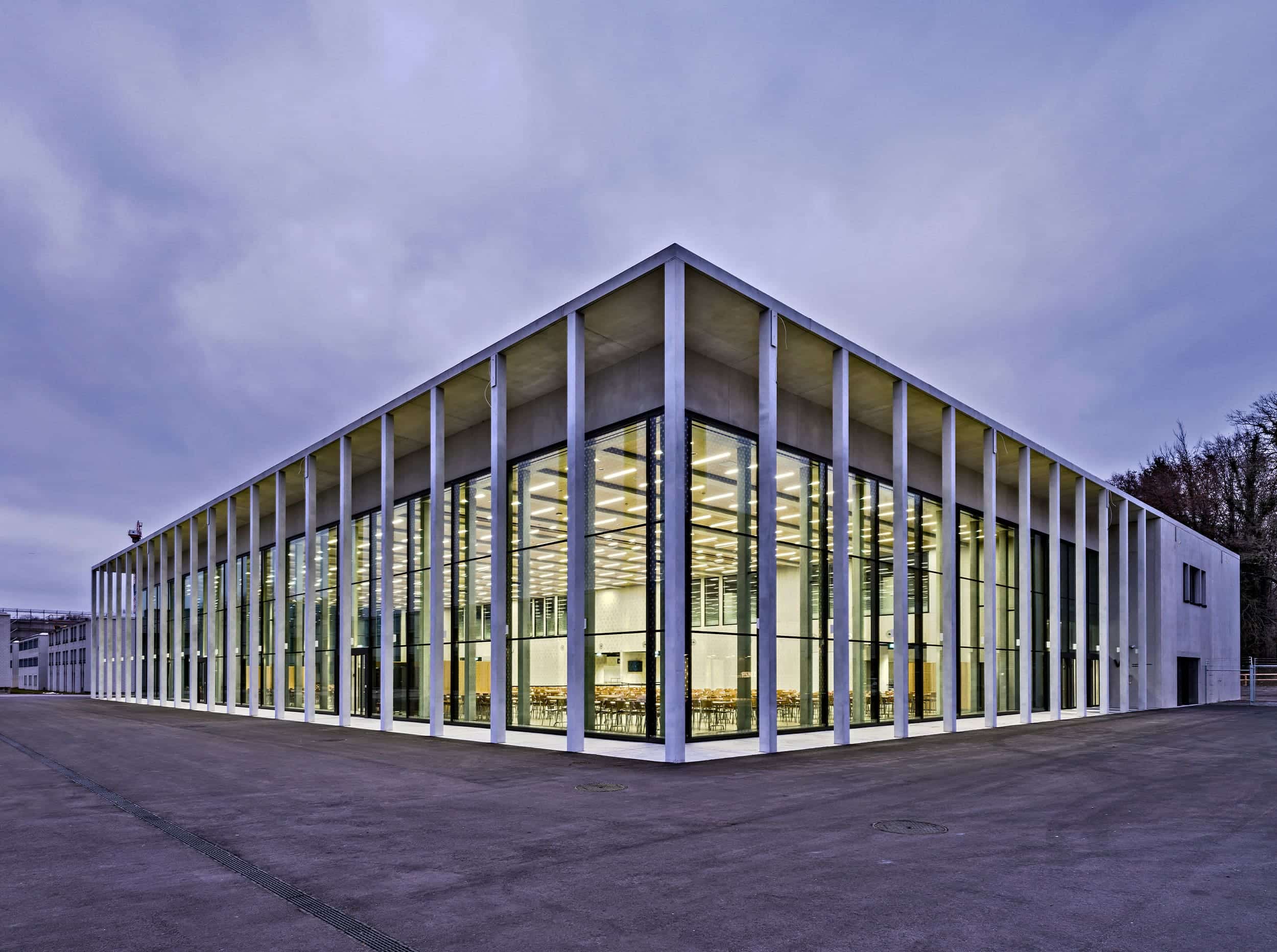 Bereits von aussen beeindruckt das Verpflegungszentrum durch seine massive und ästhetische Bauweise aus Beton und Glas. Im Inneren offenbart der Hauptsaal mit einer Höhe von über sieben Metern und grosszügigen Glasflächen die Anforderungen an die akustische Planung. Der Speisesaal bietet Platz für über 1000 Armeeangehörige, was eine schallabsorbierende Raumgestaltung unabdingbar macht. Hier entschied sich die Architektur für akustisch wirksame Holzdeckenverkleidungen, die eine angenehme Atmosphäre und akustische Ruhe schaffen.
